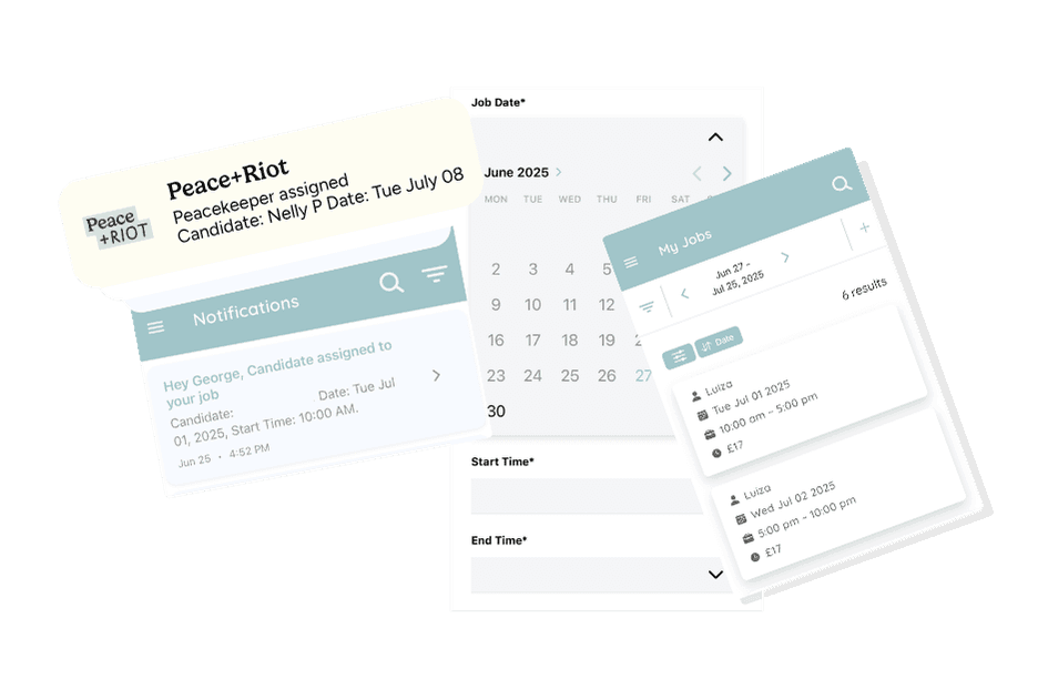 Because everything is managed through the Peace+Riot app, it is easy to sign up, request support and book trusted Peacekeepers on repeat whenever you need them.